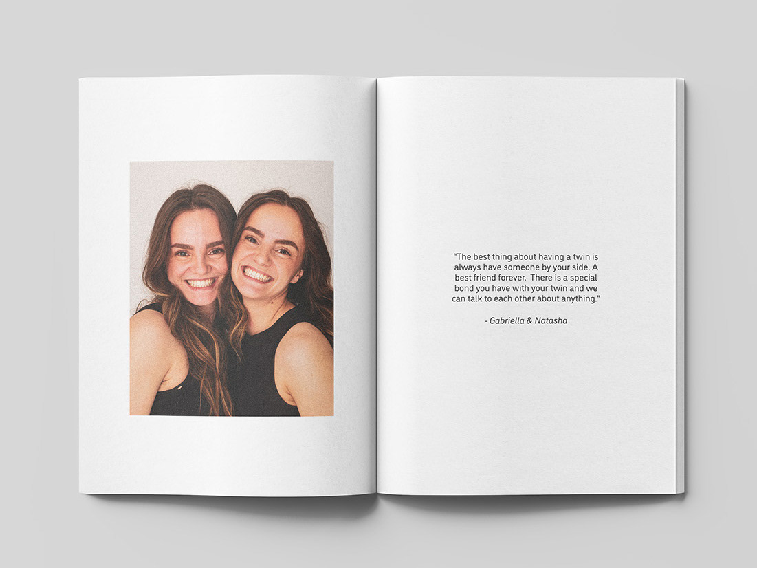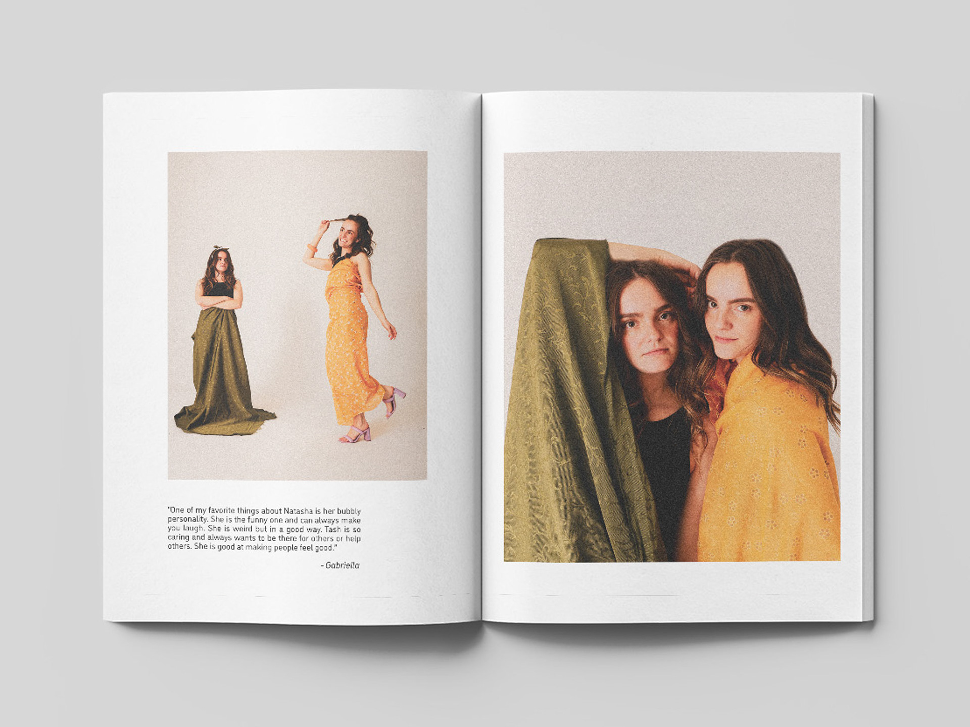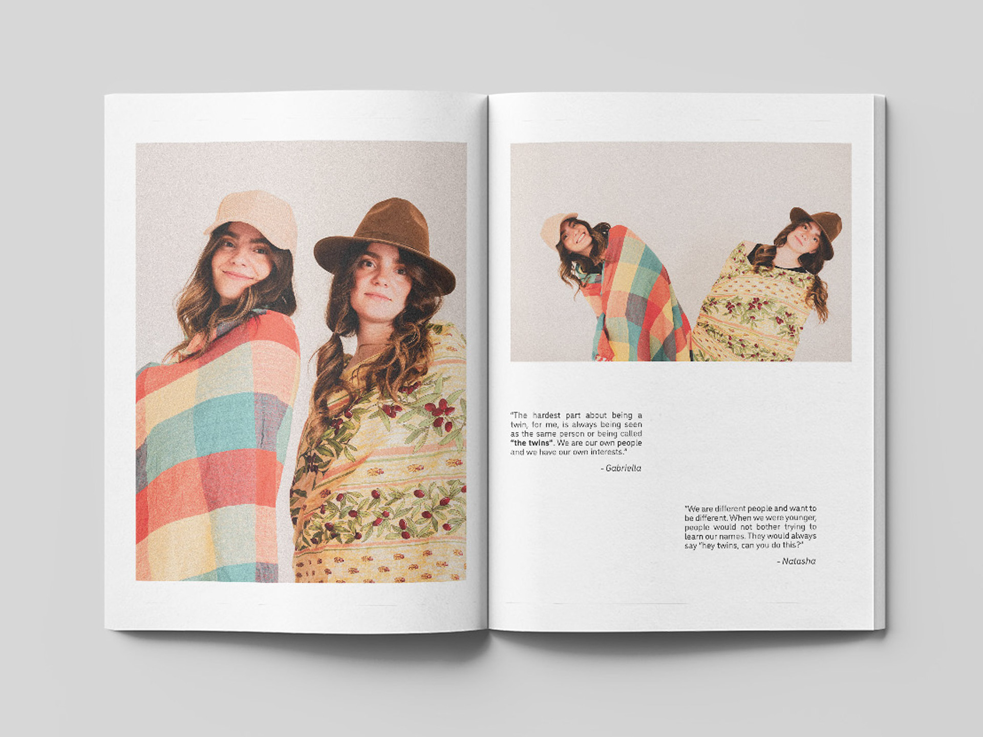 This photo essay was done for a photography class. Each model was interviewed and shared their experience on being a twin and looking identical to another person and how this has influenced who they are as an individual. In these series of photos we get to know a set of identical twins and although they are alike, they are still unique on their own. This is communicated through fashion and expression. This photo essay tells the story of twins and their visual identity as “half glass full” and “a glass half empty.” One individual is very upbeat and bubbly throughout her identity and the second individual is sad and hopeless.